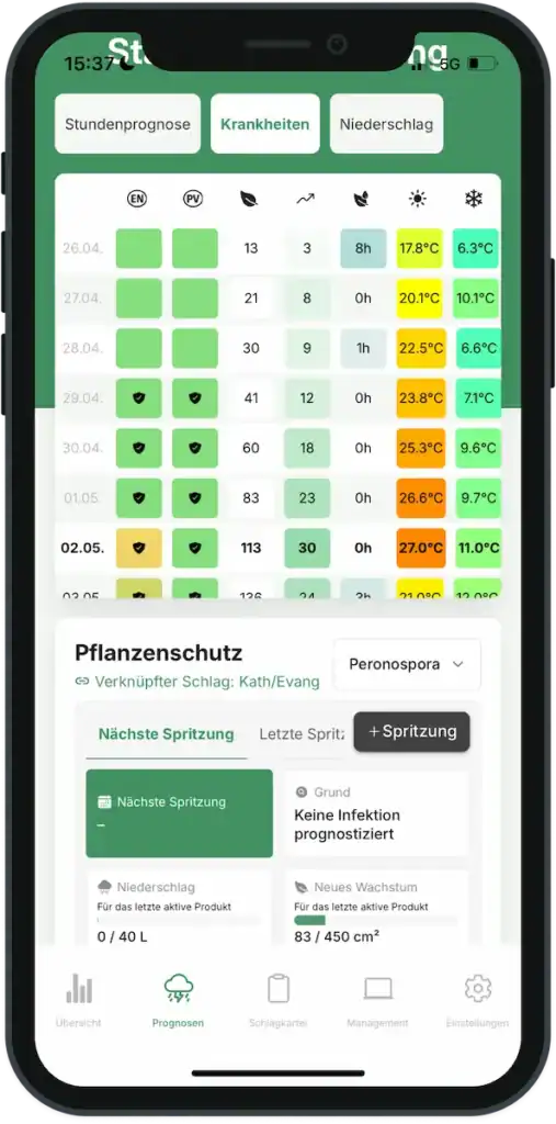 Mit seinen KI-gesteuerten Wetterdaten modelliert VineForecast genau den Krankheitsdruck für Peronospora und Oidium und liefert maßgeschneiderte Empfehlungen, wie auf die spezifischen Bedingungen in Ihrem Weinberg reagiert werden sollte.